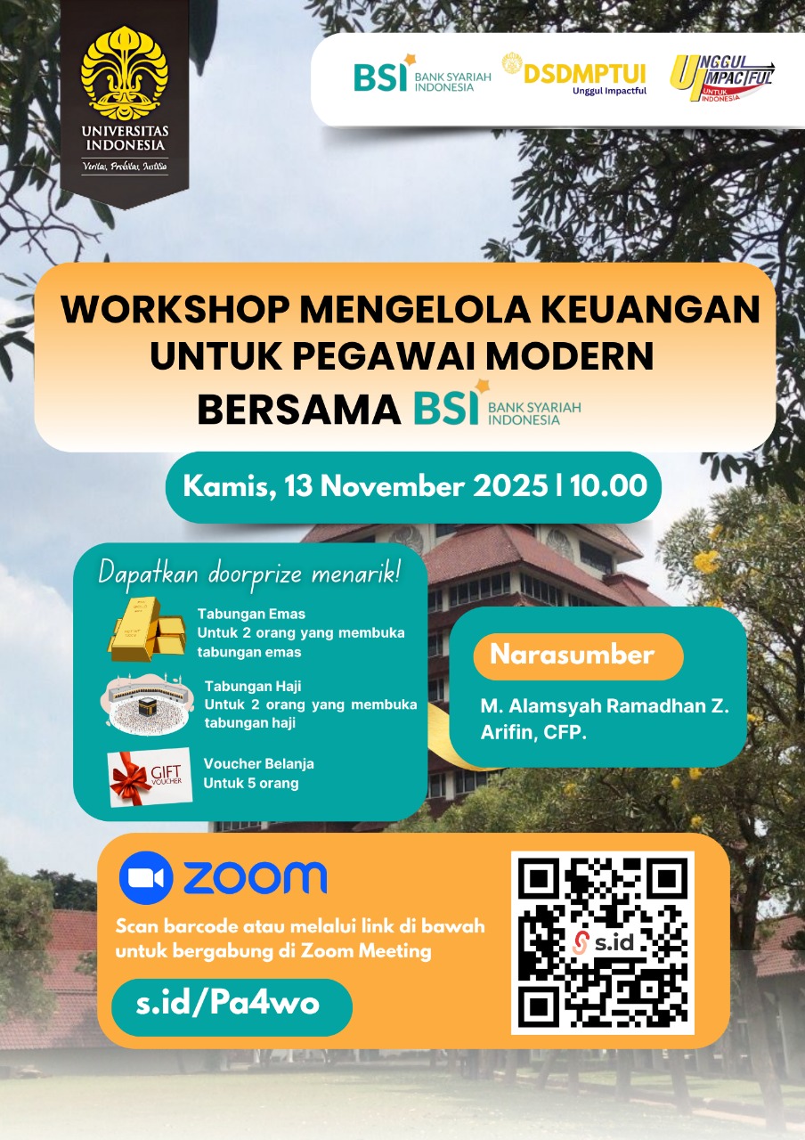 Depok, 14 November 2025 – Universitas Indonesia (UI), bekerja sama dengan Bank Syariah Indonesia (BSI), untuk menyelenggarakan lokakarya daring bertajuk ‘Mengelola Keuangan bagi Karyawan Modern’ pada 13 November 2025. Acara ini terbuka untuk seluruh karyawan UI dan berhasil menarik lebih dari 75 peserta.