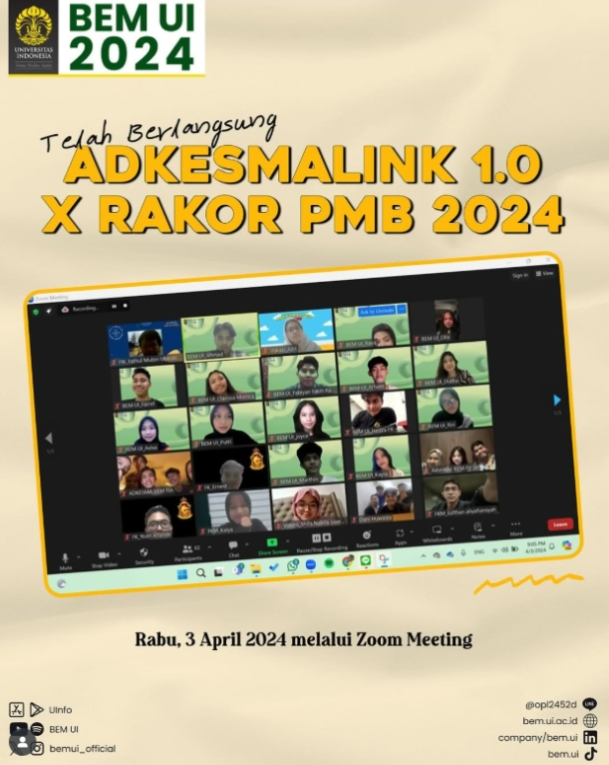 On April 3, 2024, the Adkesmalink 1.0 x PMB 2024 Coordination Meeting (on Freshmen Admission) was successfully conducted online via Zoom meeting. This forum served as a crucial platform for the internal coordination of the student executive bodies concerning student welfare and advocacy. The agenda focused on establishing working relationships, beginning with the introduction between the Student Executive Board Universitas Indonesia (BEM UI) Adkesma Functionaries and the Adkesma Departments of all faculty-level BEMs across UI. Following this, the forum proceeded with the introduction of BEM UI Adkesma’s work programs and a presentation of key issues highlighted by the BEM UI Adkesma Department. Crucially, the meeting concluded with a discussion of the strategic plan of the Adkesma Departments across all BEMs regarding the pressing issues of education fees and sexual violence, signifying a coordinated effort to address major challenges faced by the student body.