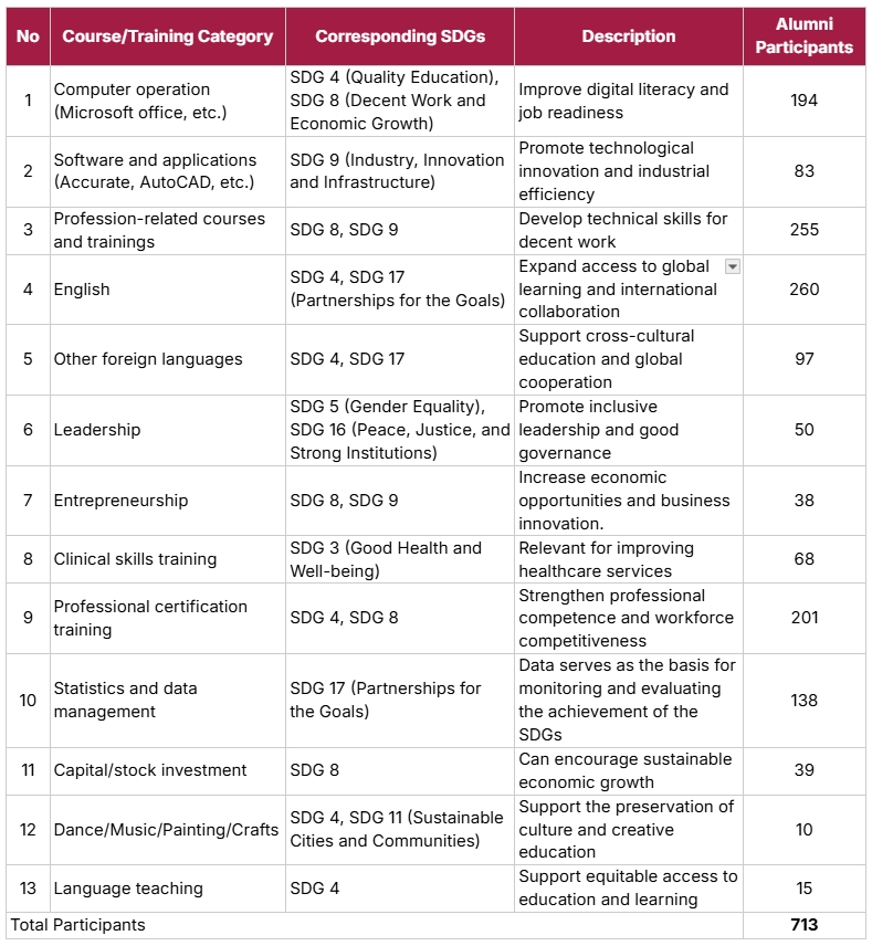 UI provides a set of dedicated courses and short trainings that explicitly address sustainability-related skills. There are a total of 13 course categories with a combined 713 alumni participants recorded in the 2024 tracer study. These courses contribute to SDG learning and capacity building, ranging from digital literacy to professional certification and the arts.