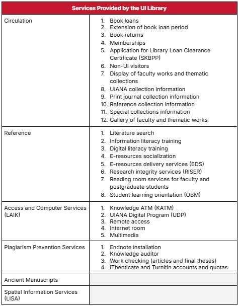 The Universitas Indonesia Library is a principal support unit for academic activities (learning, teaching, and research) housing approximately 1.5 million items across the central UI Library and several faculty libraries. As a core resource for teaching and research, the UI Library continually expands its holdings, subscribes to a wide range of online databases, upgrades its systems, and delivers high-quality services to users. Today, the UI Library serves as a reference library for higher education institutions in Indonesia and acts as a trendsetter in national library development.